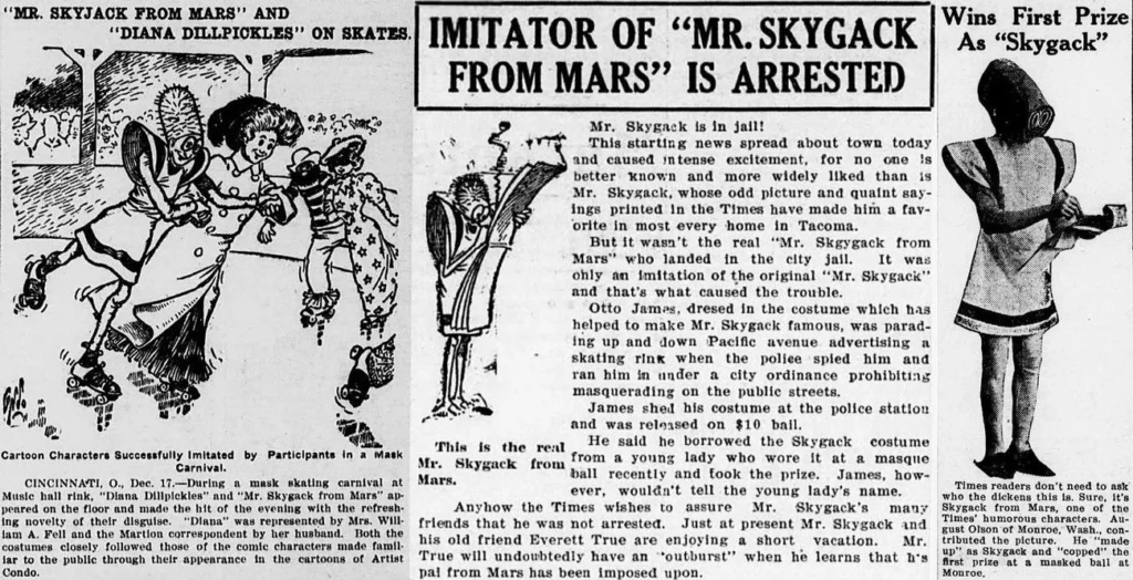 Awal abad kedua puluh sering dianggap sebagai awal mula cosplay yang tercatat. William Fell mengenakan kostum Mr. Skygack from Mars saat menghadiri pesta topeng pada tahun 1908. Karakter ini berasal dari strip komik fiksi ilmiah pertama, ‘Mr. Skygack from Mars’ yang dibuat oleh A. D. Condo untuk surat kabar Chicago Daybook yang terbit dari tahun 1907 hingga 1917. Para peserta karnaval skating bertopeng sangat terkesan dengan kostum Skygack yang dikenakan oleh William Fell, yang hadir bersama istrinya yang berpakaian sebagai Diana Dillpickles, karakter lain dari penulis yang sama. Kemudian, pada tahun 1912, August Olson dari Monroe, Washington, juga menghadiri pesta topeng dengan kostum Mr. Skygack. Ia berfoto dalam kostum tersebut dan mengirimkannya ke Tacoma Times, yang kemudian menerbitkan foto itu di halaman depan pada 24 Mei 1912. Praktik cosplay Mr. Skygack kemudian menyebar ke seluruh negeri, meskipun tidak selalu dihargai (Lunning, 2022, pp. 36–37).